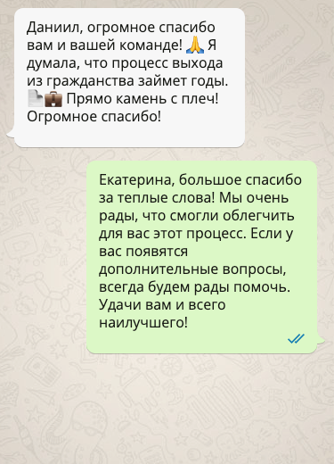 Мы знаем, какие документы требуются для выхода из российского гражданства, и проверяем их на соответствие всем требованиям заранее. Это позволяет избежать возврата заявлений и дополнительных задержек. Благодаря нашему опыту и вниманию к деталям, ваши документы будут оформлены правильно с первого раза.
